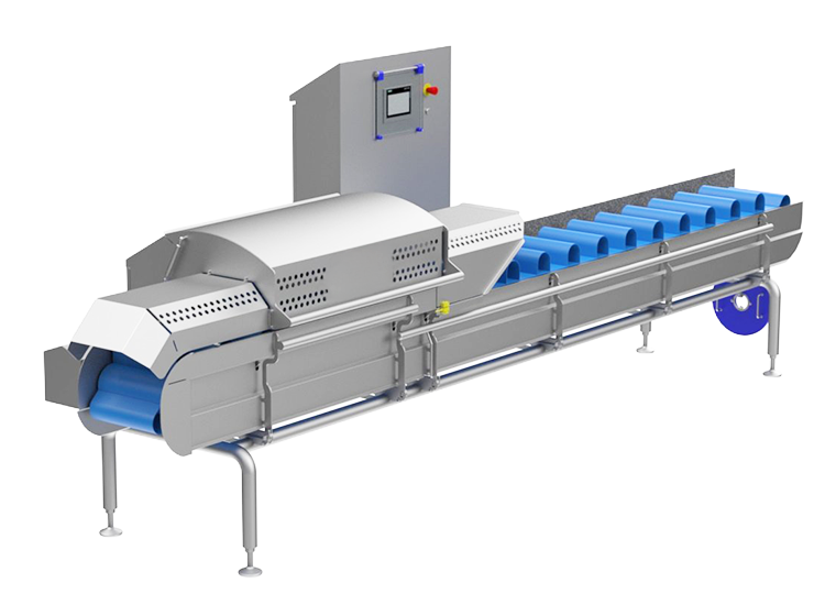Продукты размещаются в держателях на конвейере для оптимального распределения. Верхняя опорная лента фиксирует сырье во время резки, обеспечивая точную и последовательную обрезку.