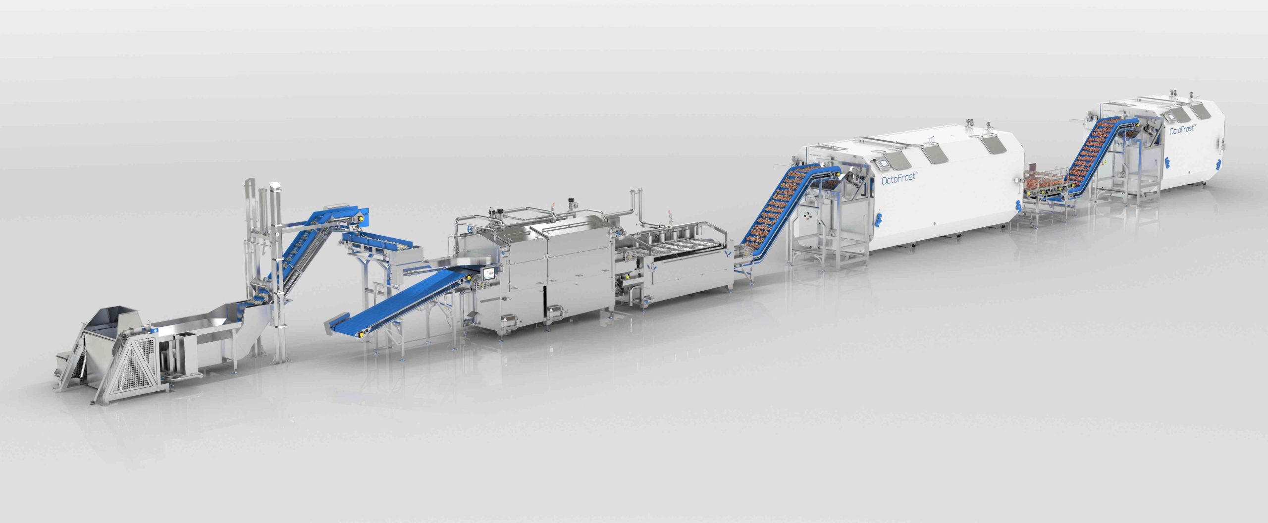 High quality IQF freezing is a two-step process; by cooling the product core with ice cold water in the OctoFrost Chiller and then freezing it in the OctoFrost IQF Freezer. The OctoFrost Chiller ensures quick chilling to the core to less than 5°C by spraying 1°C water, while meeting hygiene needs. No manpower is required in OctoFrost cooking and chilling systems which further brings down operational costs for increased profitability.