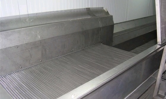 In 1970s the engineers came up with a solution and introduced the transportation belt. With this innovation it was possible to transport the product at lower air speeds, as the belt was in charge of transporting the product. However, by introducing a belt in the freezer the number of moving parts increased which is a hazard for food safety. In addition, a belt-take-up mechanism was necessary to be introduced due to temperature variations. Since 1970s, stainless steel type of mesh-belt was used in IQF freezers. Many freezers today use the same type of technique even if belt configuration can vary. The disadvantage of this belt is that it cannot produce true fluidization, as the holes in the mesh are too big. In addition, such belts would always leave belt marks on relatively fragile products such as strawberries. An efficient cleaning of such type of belt is difficult which is another important drawback.
