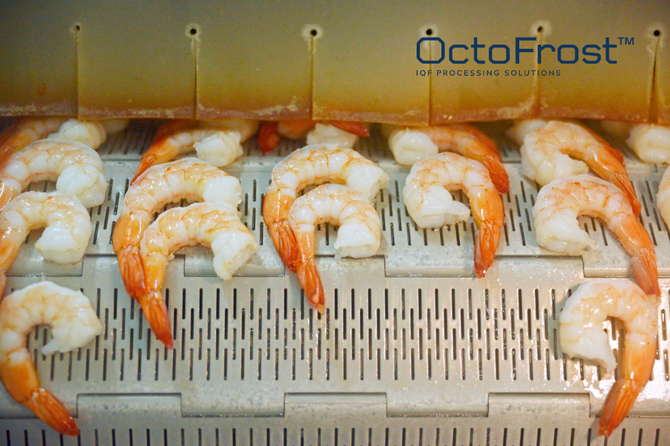 OctoFrost™ Impingement Technology Every product is surrounded by a static layer of air that insulates it and slows down heat transfer. The OctoFrost™ IF Cooker uses a rain shower system to break this static layer through impingement technology. This results in the fastest heat transfer through conductivity – the essence of OctoFrost™ Impingement technology. OctoFrost™ Crossflow System Due to the OctoFrost™ cross-flow water system, the water flowing through the IF Cooker has the exact set temperature in each zone. The food processor has absolute control over the time and temperature during the cooking process. The 3-temperature Zones The 3-temperature zones system allows the user to start with a higher temperature in zone 1 while reducing it in zones 2 and 3. This creates a “flat belly” temperature curve, allowing the heat to travel to the core of the product without overcooking the surface. Key Benefits of the OctoFrost™ IF Cooker Processors can achieve the highest possible yield due to cooking in the 3 patented temperature zones. ‘Overcooking’ is avoided, enabling a high yield and perfect product quality (color, shape, texture, and bite). There is 100% food safety regarding homogeneous cooking. No ‘undercooked’ meat, no grey spots, not even with small-sized peeled shrimp (PUD). Full temperature control in each temperature zone due to the cross-flow water system. The OctoFrost™ IF Cooker is designed for all types and sizes of shrimp (including PD, PUD, HOSO, HLSO and EZ Peel). Additional Benefits: • CIP system in place. • Significantly faster heat transfer due to the impingement rain shower system. • A high volume of recirculated water over the product. • Energy efficient steam injection into the cooking water. • Weighing belt for an even infeed into the IF cooker. • Three infeed options that allow for great flexibility; bulk, belt, and tray infeed. Have any questions? Reach out to our Sales team: sales@octofrost.com